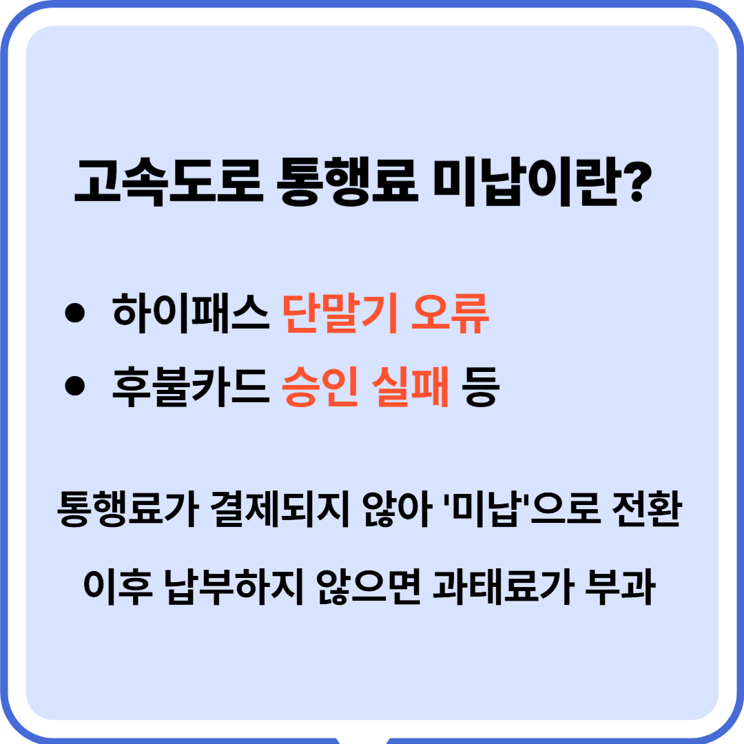 하이패스 단말기 오류, 후불카드 승인 실패 등으로 인해 통행료가 결제되지 않으면 '미납'으로 전환되며, 이후에도 납부하지 않으면 과태료가 부과됩니다.