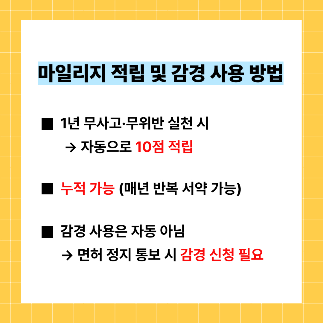 포인트: 마일리지는 자동 적용되지 않으므로, 반드시 면허 정지 통보 시 직접 감경 요청을 해야 효과를 볼 수 있습니다.