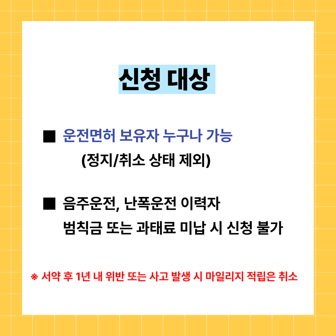 | 제한 조건 | 음주운전, 난폭운전 이력자 / 범칙금 또는 과태료 미납 시 신청 불가 |