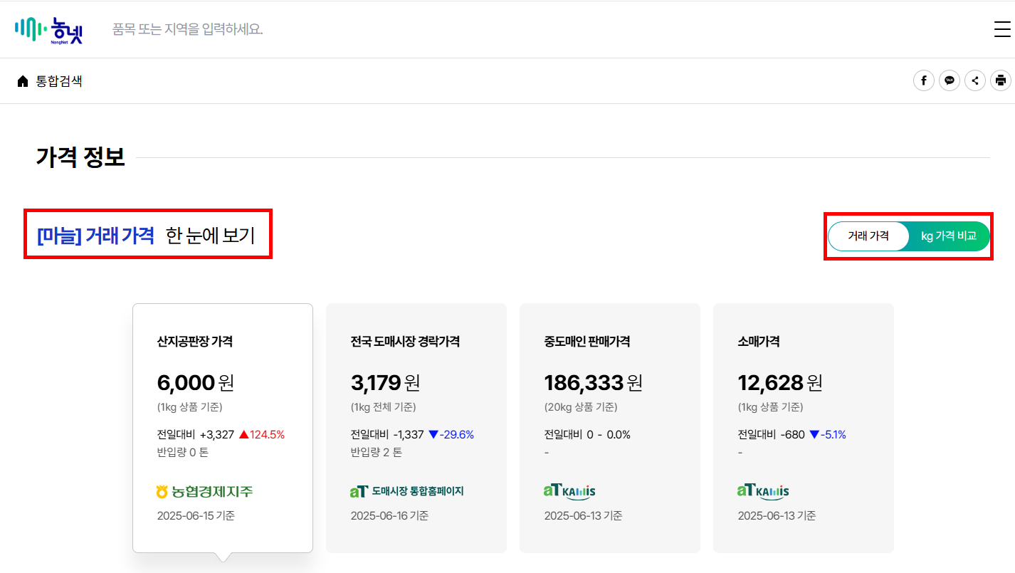 - 검색창에 ‘마늘’ 또는 ‘배추’ 입력 → 지역·시장 선택