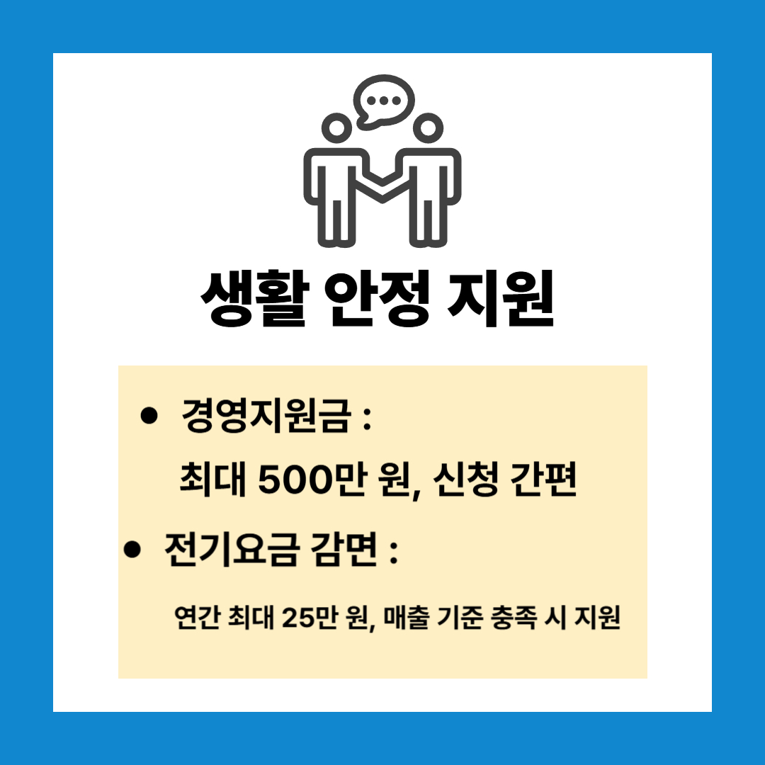- 전기요금 감면: 연간 최대 25만 원, 매출 기준 충족 시 지원
